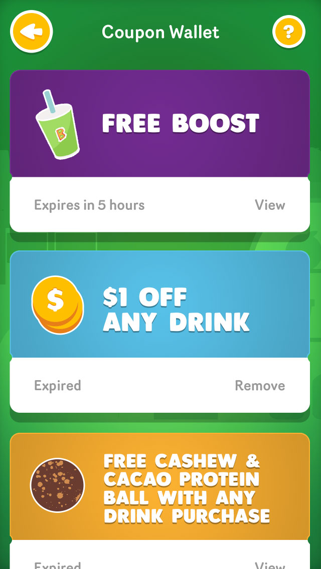 Coupons collected by playing the game expand and collapse on tap, allowing easy access to the barcode within the same UI layer.